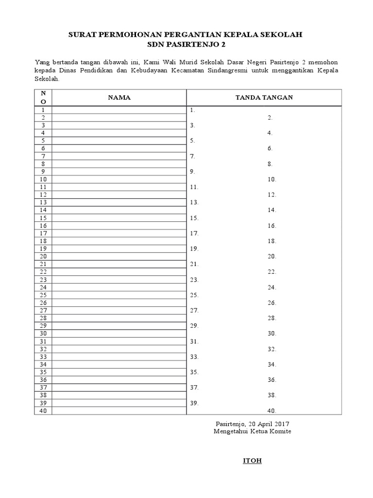 Surat Permohonan Perubahan Specimen Bank from imgv2-1-f.scribdassets.com Berikut contoh surat keterangan pergantian kepala sekolah di rekening dana bos. Lamongan, 13 agustus 1983 nim : Doc contoh surat pengajuan cuti melahirkan psb darulmaarif academia edu. Untuk mengganti spesimen atau tanda tangan tersebut perlu adanya surat spesimen pergantian kepala sekolah untuk bank dari sekolah yang bersangkutan. Demikianlah pembahasan yang dapat kami sampaikan mengenai contoh surat pemberitahuan pergantian kepala sekolah ke dinas. Sutopanitro pr maka mulai tahun ajaran 20112012 telah dilakukan pergantian kepala sekolah dasar esti bakti yang semula dijabat oleh. 17 contoh surat rekomendasi baik benar dan yang disarankan. Surat ini sebagai bukti bahwa telah terjadi pergantian pimpinan di sekolah, dan akan diganti nama kepala sekolah tersebut di rekening dana bos.