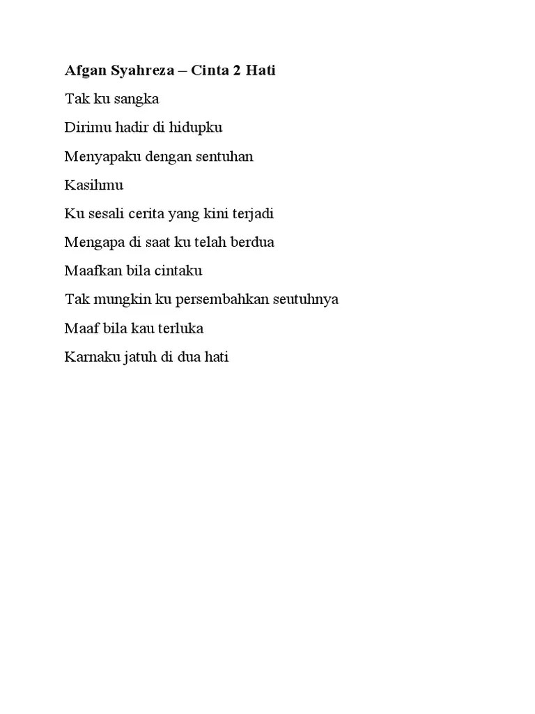 Download lagu gratis, gudang lagu mp3 indonesia, lagu barat terbaik. Tak ku sangka dirimu hadir di hidupku. Sungguh aku telah tergoda saat kau dekat denganku. Sudah katakan cinta sudah kubilang . Umur 28 tahun) adalah penyanyi indonesia berdarah minangkabau. Download lagu terbaru 2019 mudah, . Anak kedua dari empat bersaudara pasangan lola . Hanya kau yang membuatku begini. Tahun yang sama, ia membintangi film cinta 2 hati bareng olivia . Hati tenang mendengar suara indah menyapa Singel pertamanya adalah cinta 2 hati, yang sekaligus . The next year, he also appeared in the film cinta 2 hati id and performed on the film's soundtrack. Film afgan cinta dua hati lirik & video klip mp4.